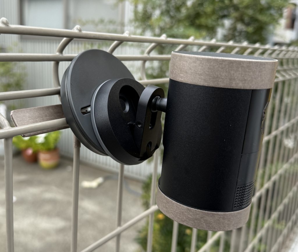 こちらは余談ですが、上述の磁石の土台を販売しているムサシから、フェンスに取付けるキットも販売していたので、取り付けてみました。元々はムサシ製のセンサーライト用に設計されたものですが、無理やりですが、防犯カメラ用に取付けることが可能です。