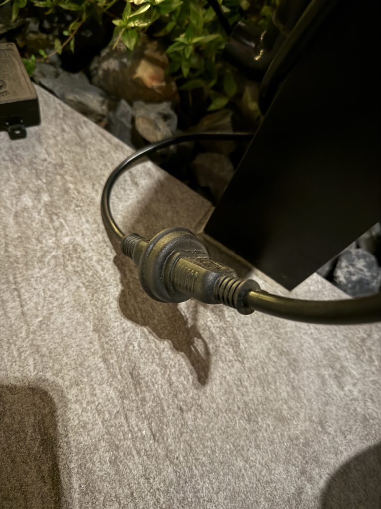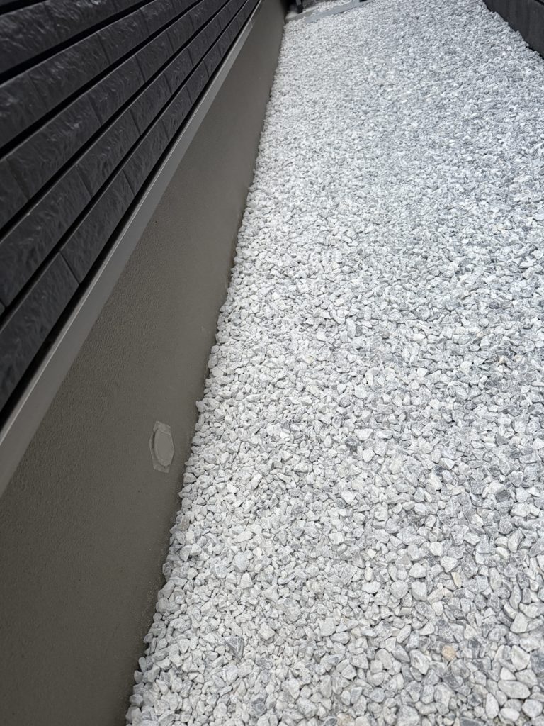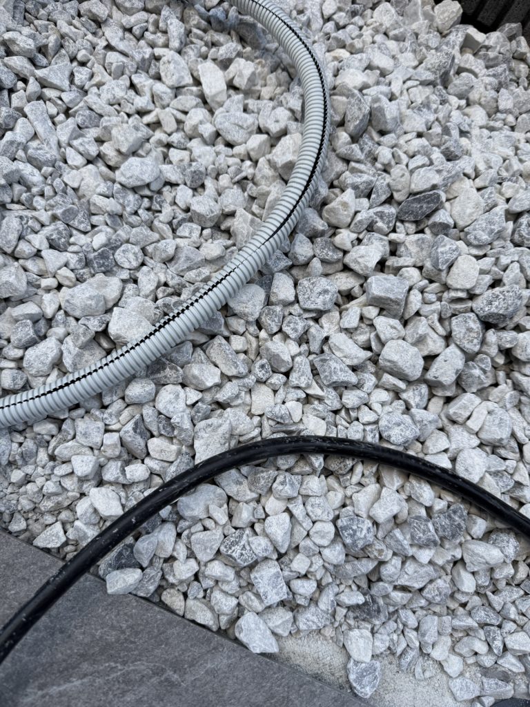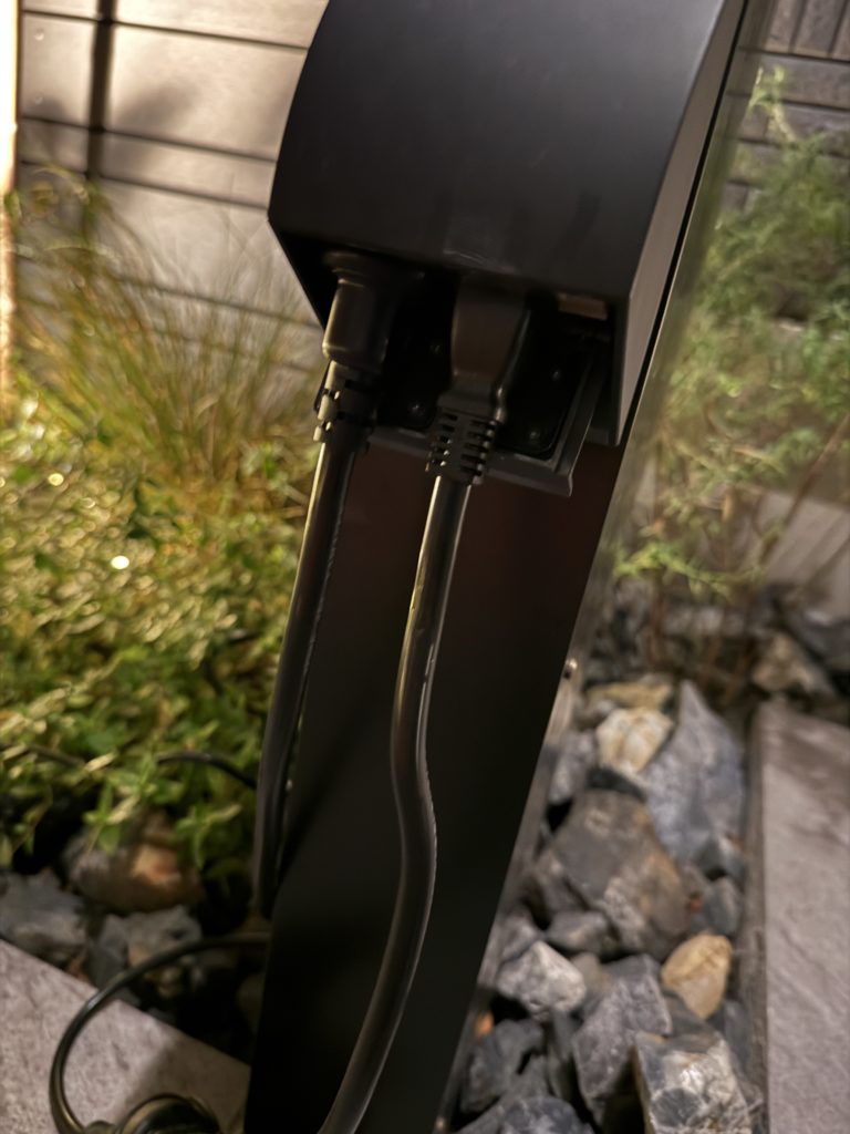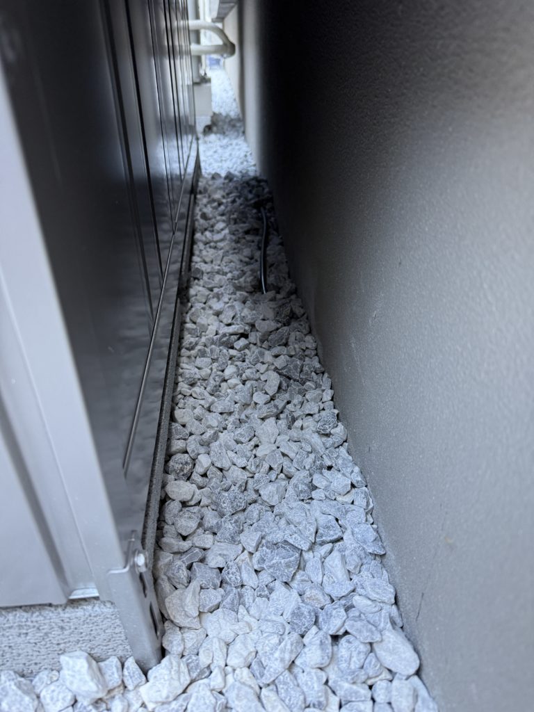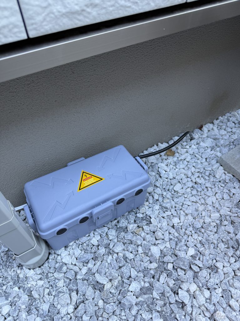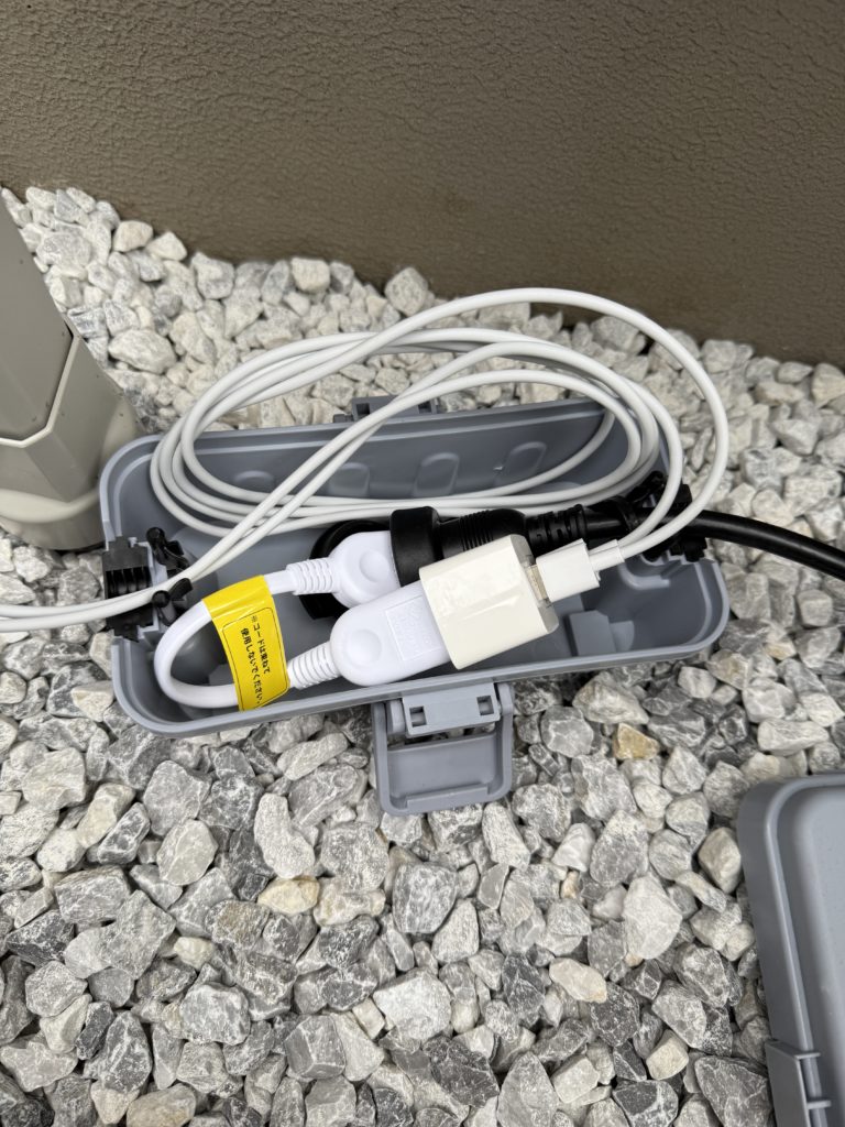 さて、無事に電源ケーブルの用意ができましたら、延長ケーブルを家の外壁に沿わせて配線し、砂利の下に隠蔽します。我が家の場合はすっぽり隠すことができましたが、ここはご家庭の状況に応じてアレンジしてください。