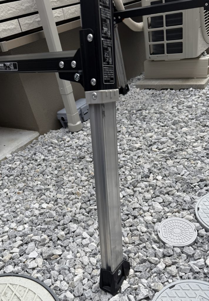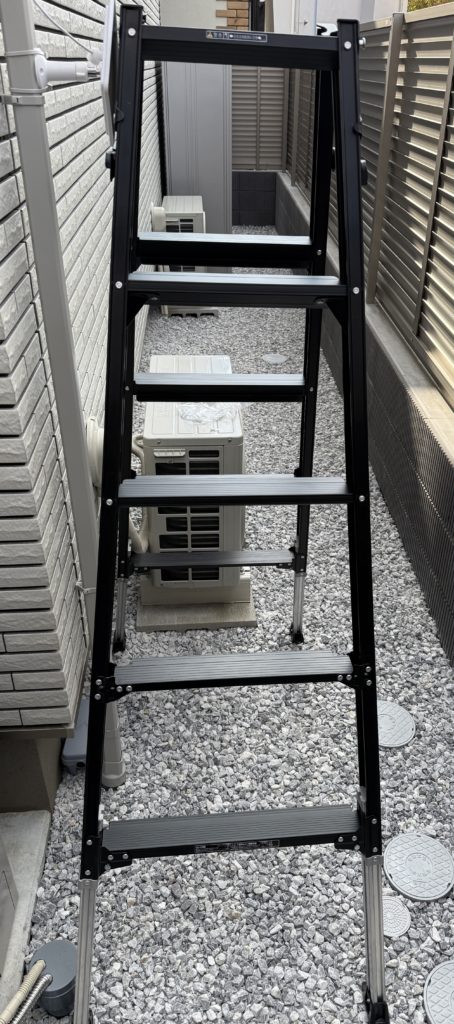 さらについでにオススメ品のご紹介ですが、脚立です。我が家の同じような雨樋の位置に設置する場合、高さ3.5mほどに位置になりますが、脚立もそれなりの大きさのものを選択する必要があります。