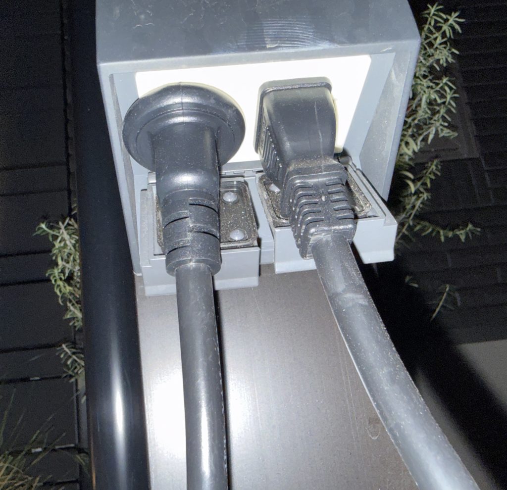 ちなみに屋外用コンセントで、元々何らかの屋外ケーブルを使用している場合、屋外用コンセントの外形が大きい影響で、2本同時に結線できません。下記写真のように、左側が屋外用の延長ケーブルですが、径が大きいので2つ刺すことが難しいのです。