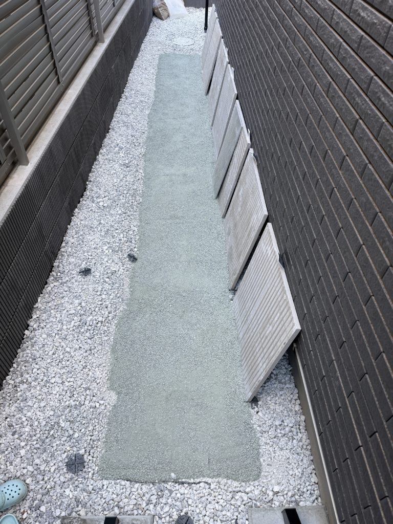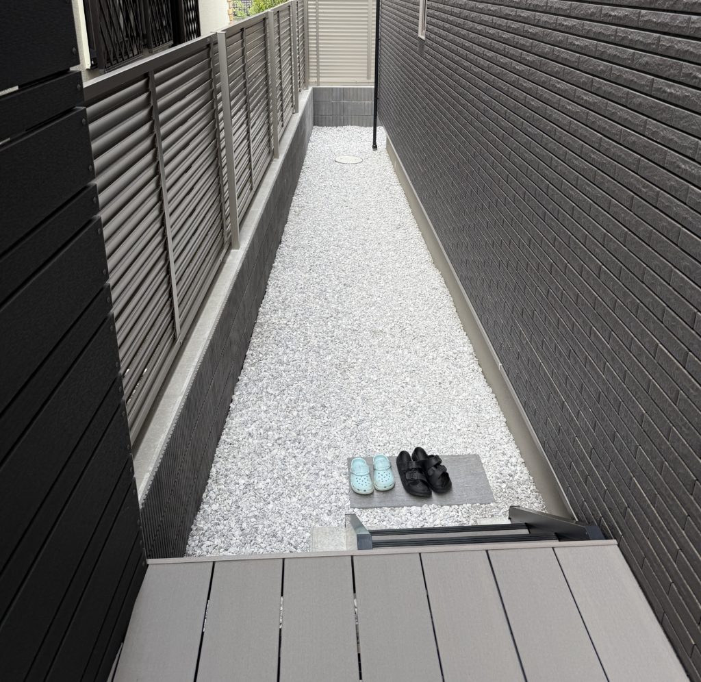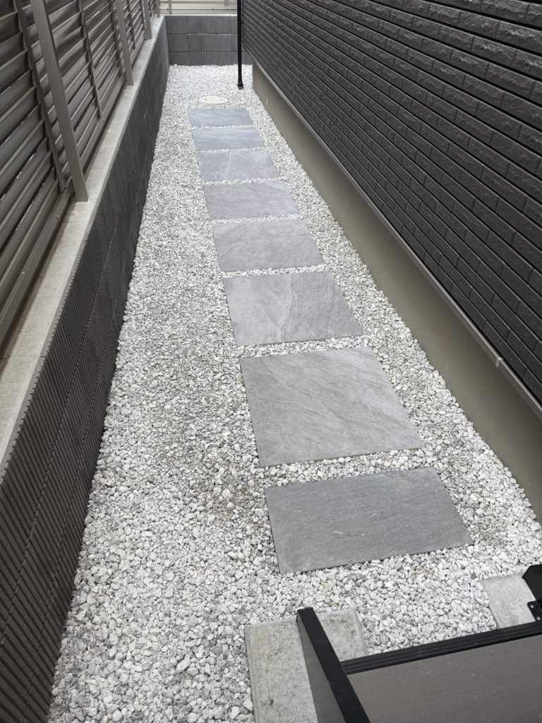 我が家も、あまり重要ではない通路部分は、一般的なやり方である①防草シート、②砂利、のセットで外構工事をしました。