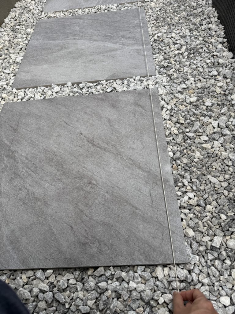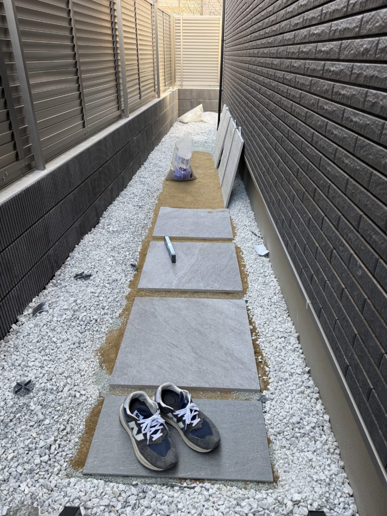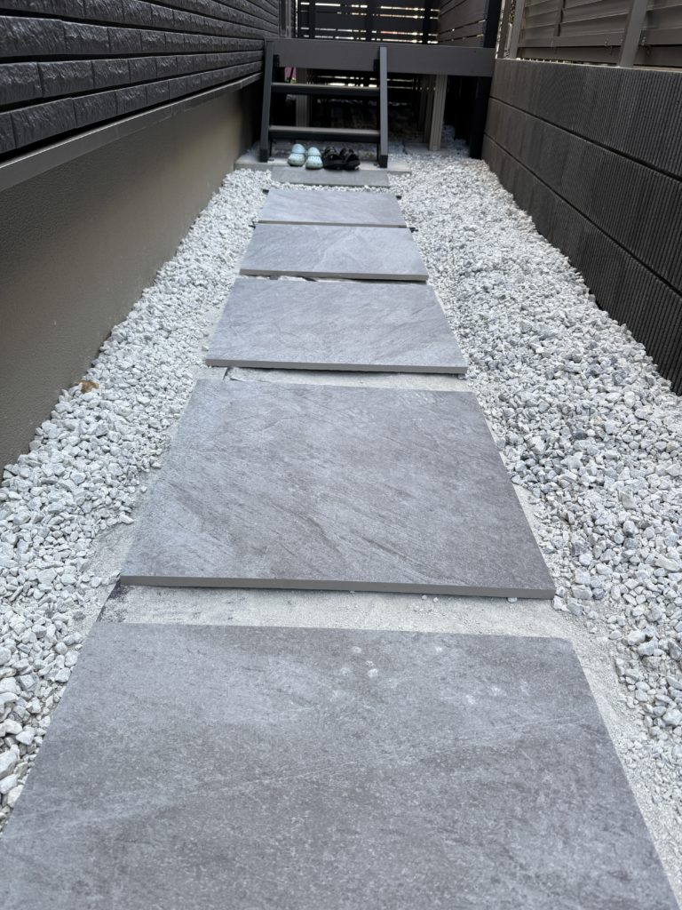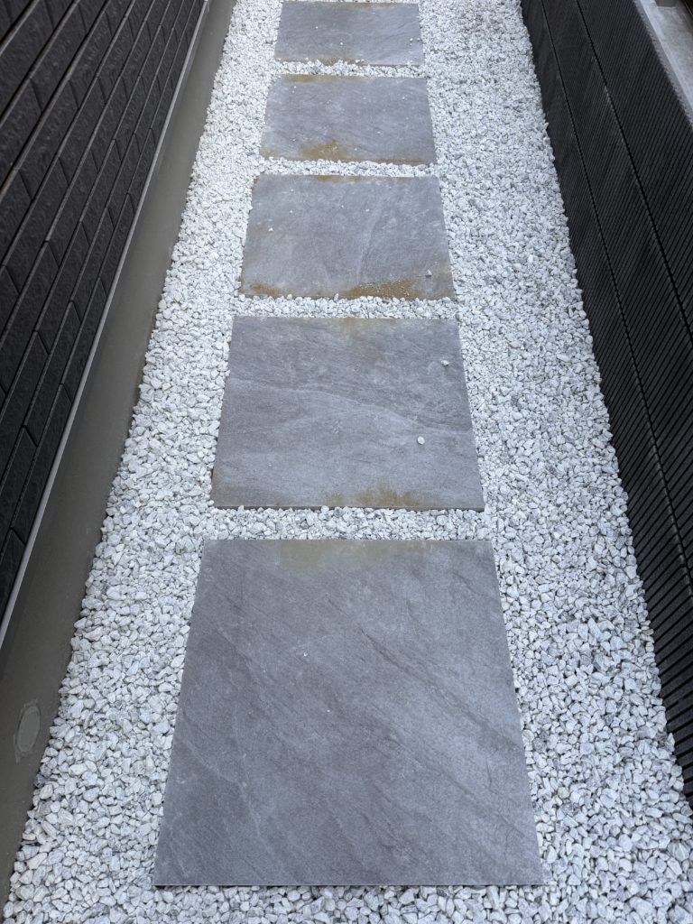 好みの問題ではありますが、タイル間を等間隔で数cm開けて、その間に砂利を入れるとオシャレに仕上がります。