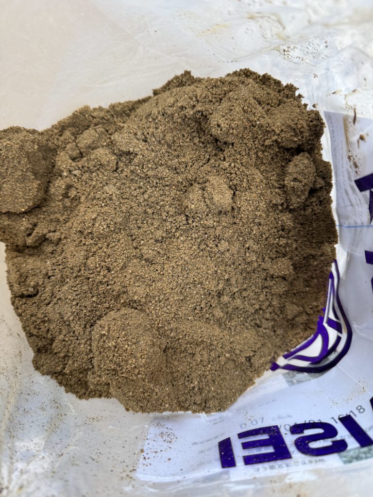 下記写真は雨で湿気がたまった後に袋から取り出した真砂土ですが、少し固まっているのが分かります。水分がなくなるとサラサラした土になります。※ガチガチに固って戻らないタイプもあるので注意してください。