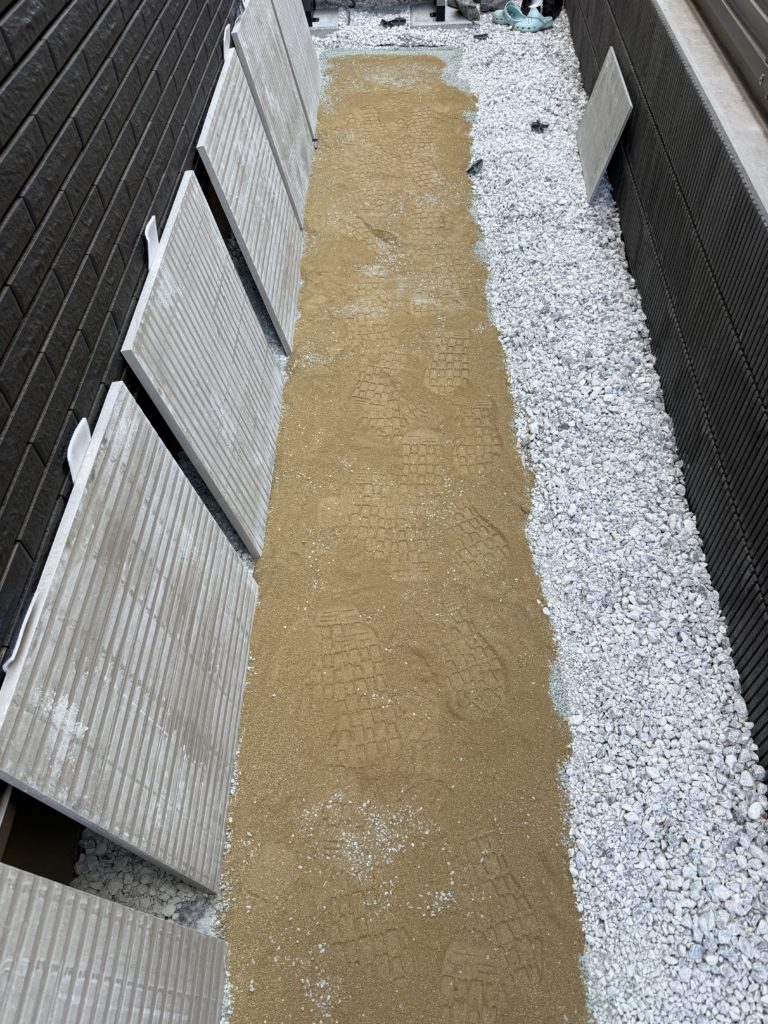 次に、青砕石の上に敷いたのは真砂土(まさど)と呼ばれる土です。普通の土だとサラサラで雨で流れてしまうので、粘土質な土を使いました。青砕石だけでも良いと思うのですが、タイル裏にピタッと密着する水平面を作りたかったので、①青砕石0-5mm = 構造(支える)、②真砂土 = 仕上げ(整える)という思想で2段構成にしました。