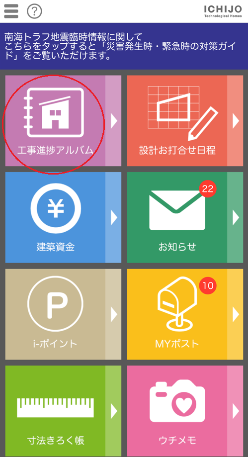 新築工事の過程を一条工務店では「工事進捗アルバム」という形で専用アプリに工事担当者が配信してくれます。工事着手後にアプリに追加されますので、初期状態だと表示されません。