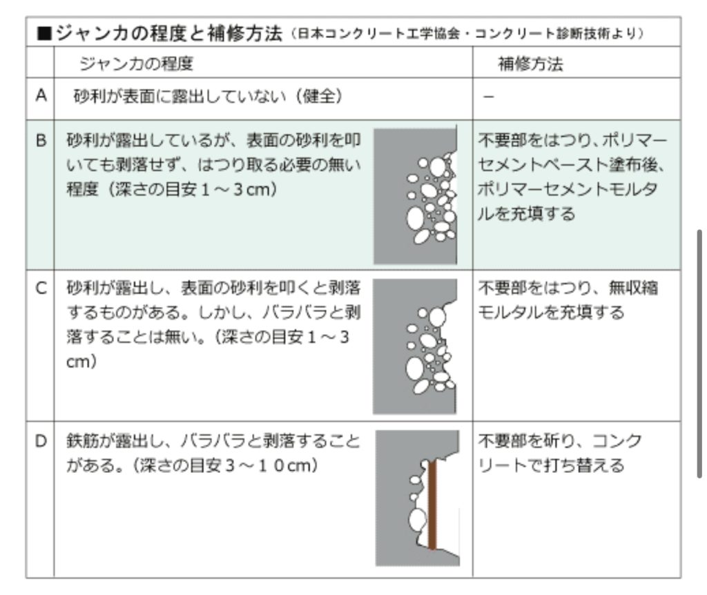 日本コンクリート工学協会の記事によると、ジャンカの程度と補修方法について、非常に分かりやすく纏められていました。私のケースは、ほとんどが1-2cm程度の深さでしたので、この指針を一条側に提示して、ハイモルと呼ばれるポリマーセメントペーストで補修してもらいました。