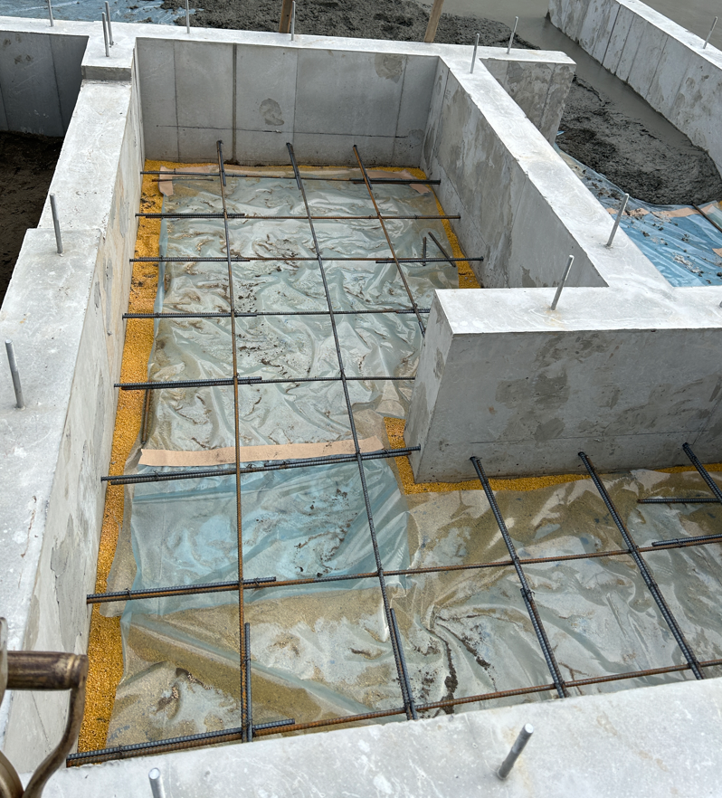 下の写真は土間部分の基礎工事の様子です。防湿シートやコシペレット、鉄筋の配列がおこなわれています。