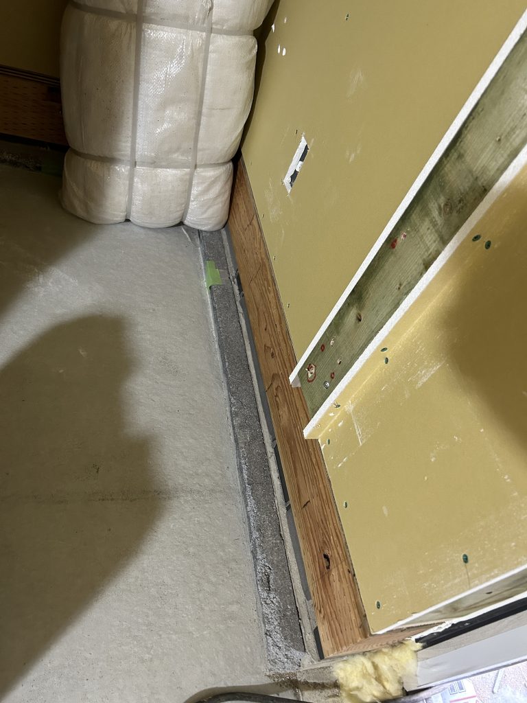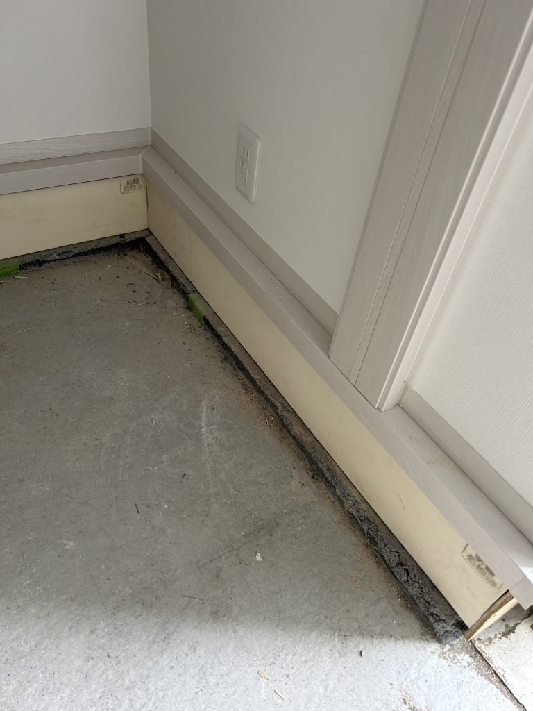 その後、土台据えの工程で玄関の土間の形が作られます。隙間にも断熱材が施されていることが分かります。