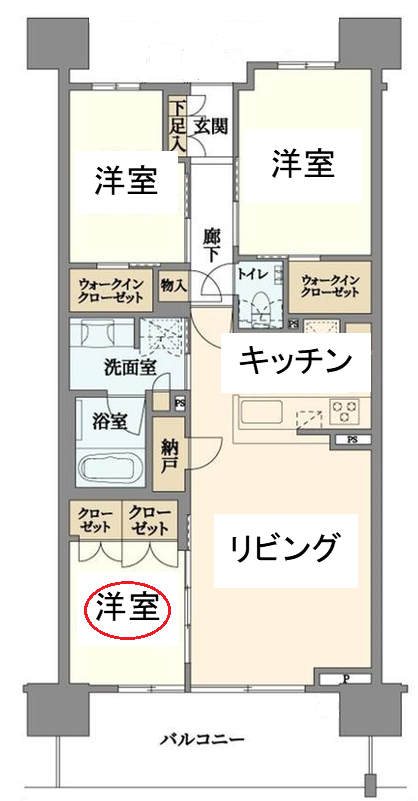 子供が2人いる場合には、子供に一人部屋を与えることが難しくなってきます。下記の絵は典型的なマンションの間取りで洋室を備えた3LDKですが、リビングの横にある洋室はスライダーで区切られただけの簡易的な居室(音漏れもガンガンします)になっているため、子供が大きくなった時のことを考えると勉強や睡眠を落ち着いてできる部屋とは言い難い環境です。中学生以上になったり、性別の異なる兄弟がいるご家庭は、戸建てへ住み替える方が増えていく印象です。