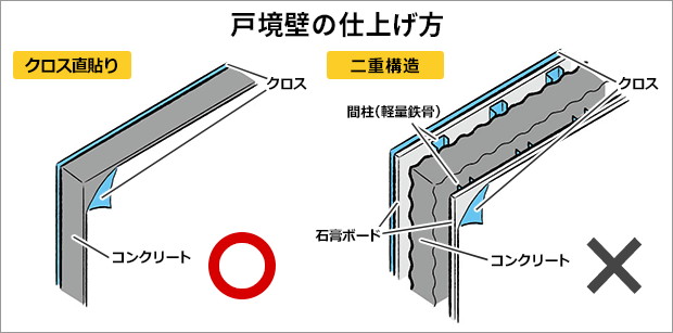 逆に遮音性が高い場合は、壁を叩いてもズシンとした感触で音が全く響かない (≒クロス直張り)